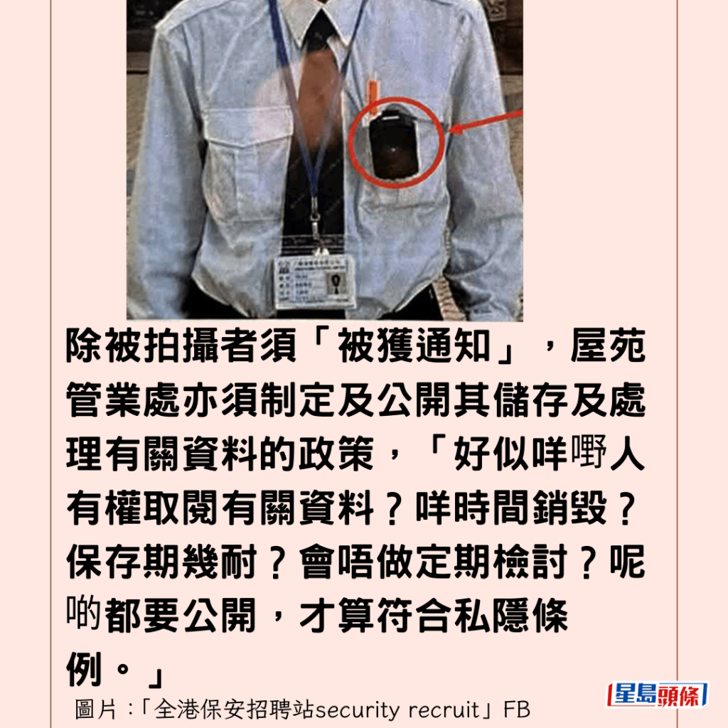 大律師陸偉雄回覆《星島頭條》表示,有關屋苑保安配備隨身攝錄機,非常少見,措施需要滿足多個條件才符合私隱條例,除被拍攝者須「被獲通知」,屋苑管業處亦須制定及公開其儲存及處理有關資料的政策,「好似咩嘢人有權取閱有關資料?咩時間銷毀?保存期幾耐?會唔做定期檢討?呢啲都要公開,才算符合私隱條例。」