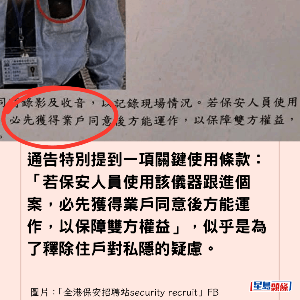 通告特別提到一項關鍵使用條款:「若保安人員使用該儀器跟進個案,必先獲得業戶同意後方能運作,以保障雙方權益」,似乎是為了釋除住戶對私隱的疑慮。
