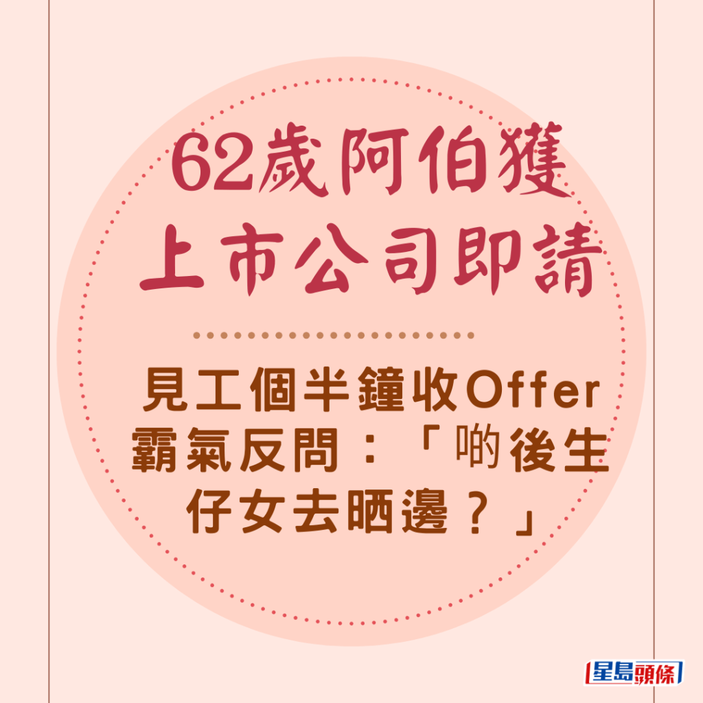 62歲阿伯獲上市公司即請 見工個半鐘收Offer 霸氣反問:「啲後生仔女去晒邊?」↓↓↓↓
