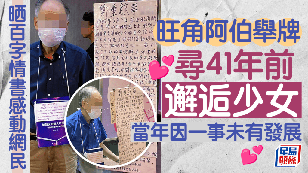 同場加映:旺角阿伯舉牌尋41年前邂逅少女 晒百字情書感動網民 當年因一事未有發展↓↓↓↓