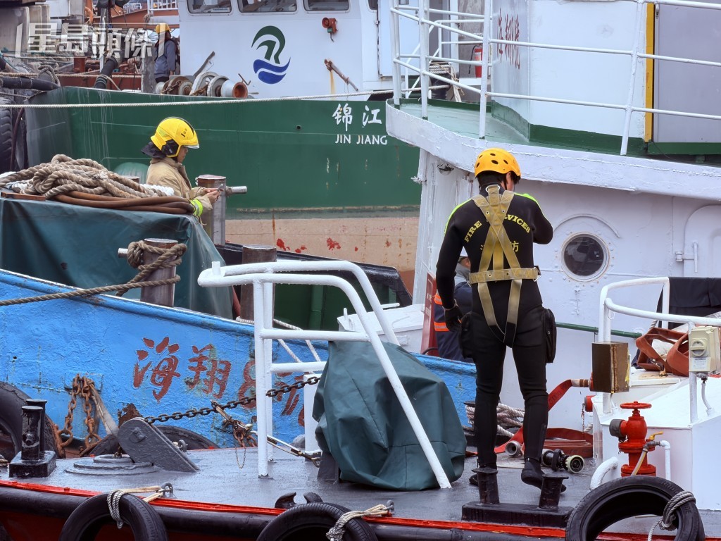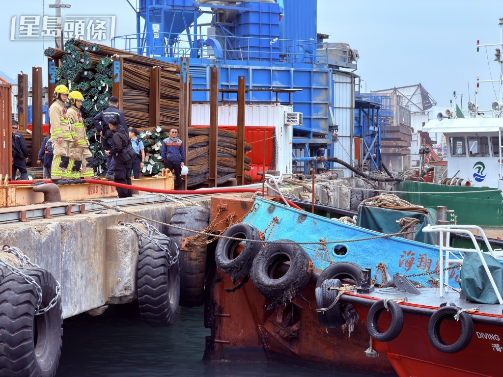 駁船冒煙,消防到場救熄並檢查船艙。梁國峰攝