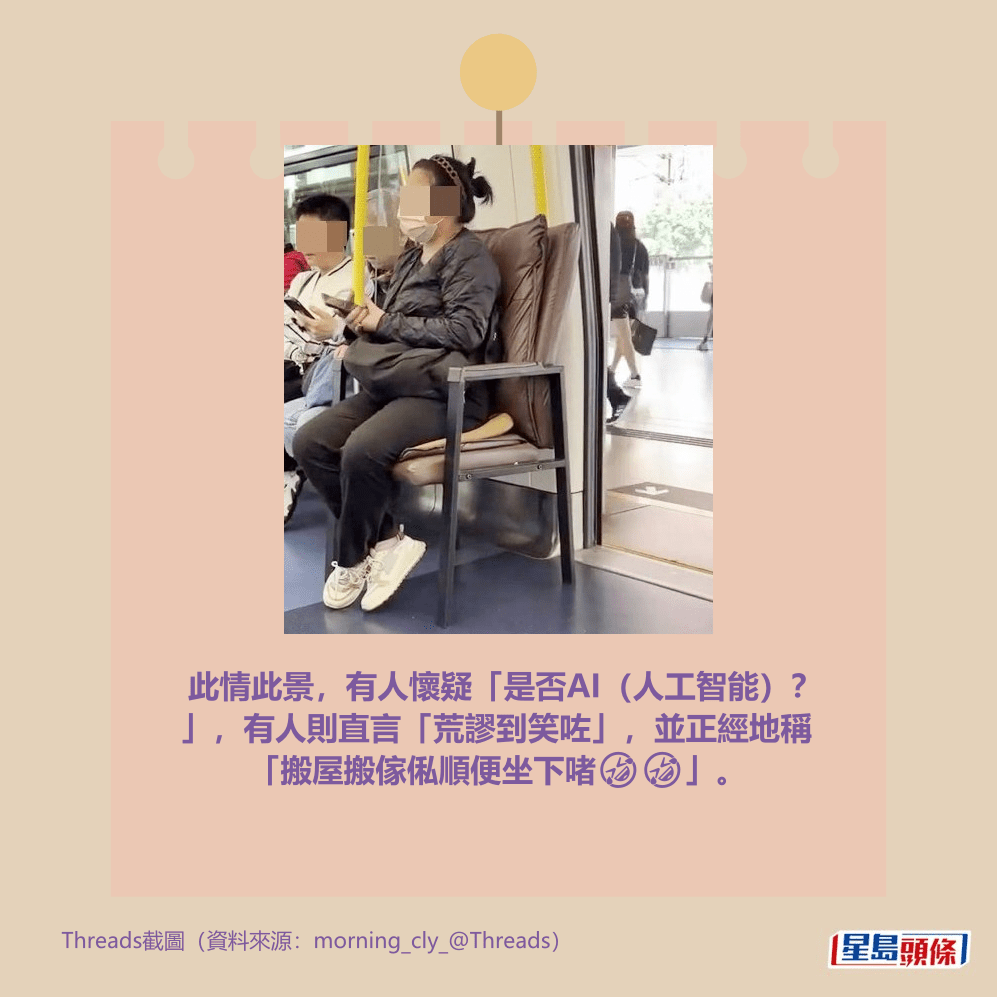 此情此景,有人懷疑「是否AI(人工智能)?」,有人則直言「荒謬到笑咗」,並正經地稱「搬屋搬傢俬順便坐下啫🤣🤣」;有人更坦言「唔係講笑想坐呢個位」,甚至指「張凳好正,想買」。