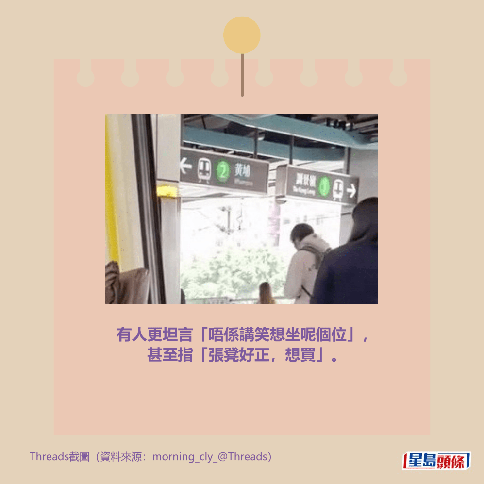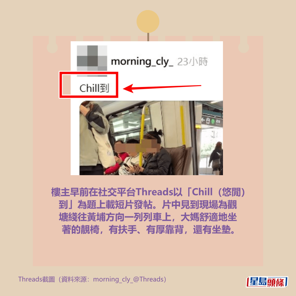 樓主早前在社交平台Threads以「Chill(悠閒)到」為題上載短片發帖。片中見到現場為觀塘綫往黃埔方向一列列車上,大媽舒適地坐著的靚椅,有扶手、有厚靠背,還有坐墊。