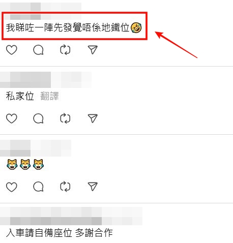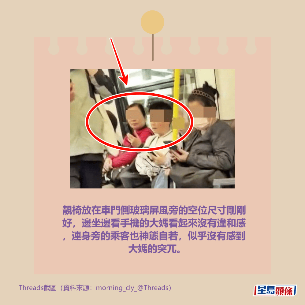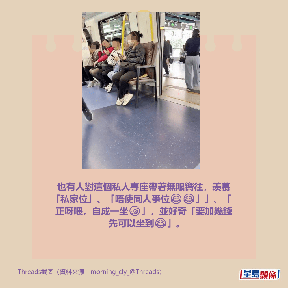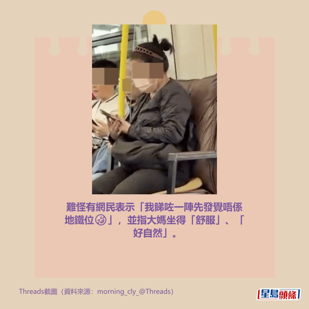 靚椅放在車門側玻璃屏風旁的空位尺寸剛剛好,邊坐邊看手機的大媽看起來沒有違和感,連身旁的乘客也神態自若,似乎沒有感到大媽的突兀。難怪有網民表示「我睇咗一陣先發覺唔係地鐵位🤣」,並指大媽坐得「舒服」、「好自然」。