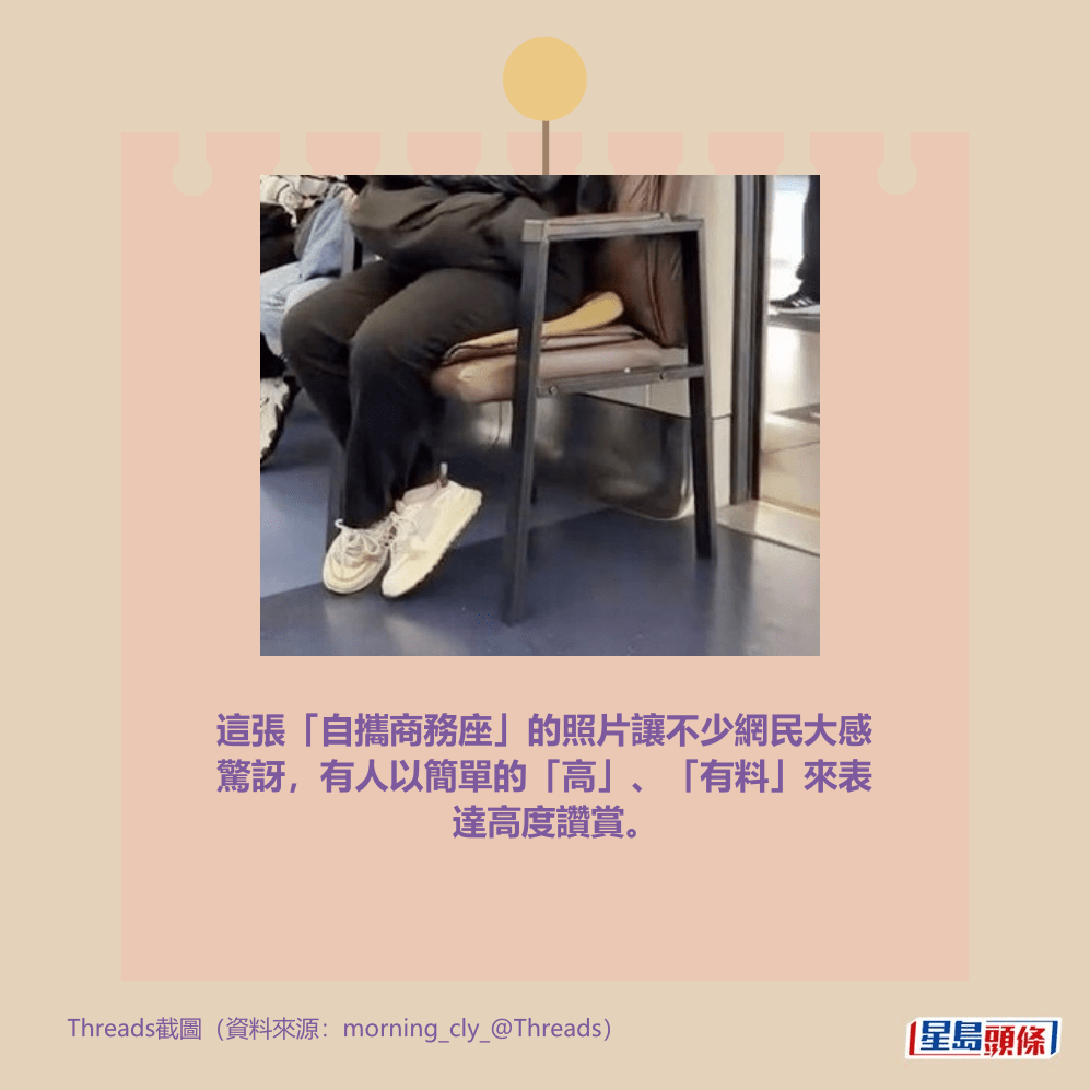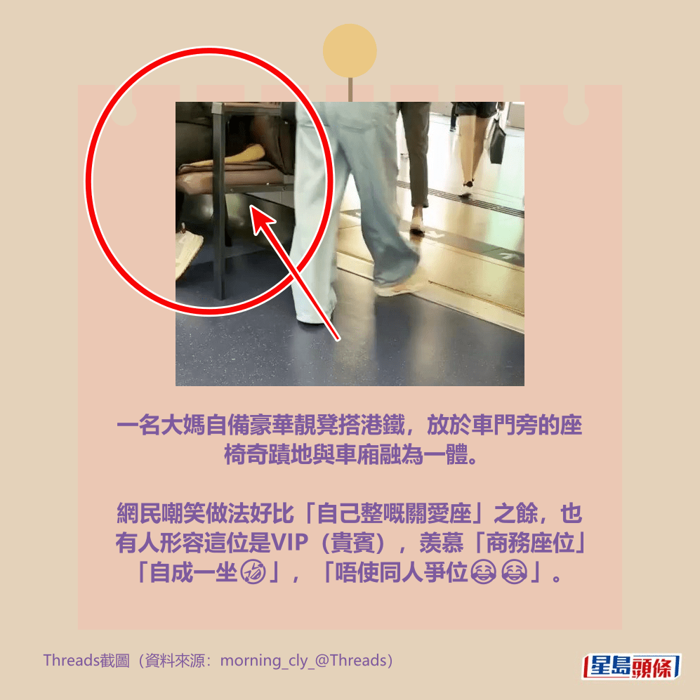 一名大媽自備豪華靚凳搭港鐵,放於車門旁的座椅奇蹟地與車廂融為一體,網民嘲笑做法好比「自己整嘅關愛座」之餘,也有人形容這位是VIP(貴賓),羡慕「商務座位」「自成一坐🤣」,「唔使同人爭位😂😂」。詳情見下圖及下文: