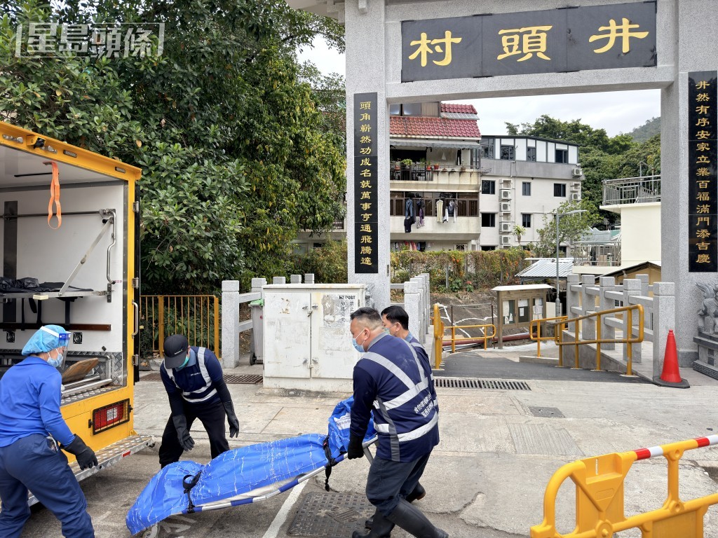 今晨(10日)涉事村屋仍被圍封,有警員駐守並繼續搜證,包括搜尋涉案的可疑兇器。至早上近10時,仵工進入村內,將死者遺體抬上車輛,之後移送往殮房。據女街坊表示,昨日(9日)中午還見過陳男,當時對方並無異樣:「12點半見佢(陳男)返嚟屋企,我去廁所,睇見佢行返嚟。」有村民則表示,目睹死者的妻子被警員拘捕,「笠頭套帶走」。