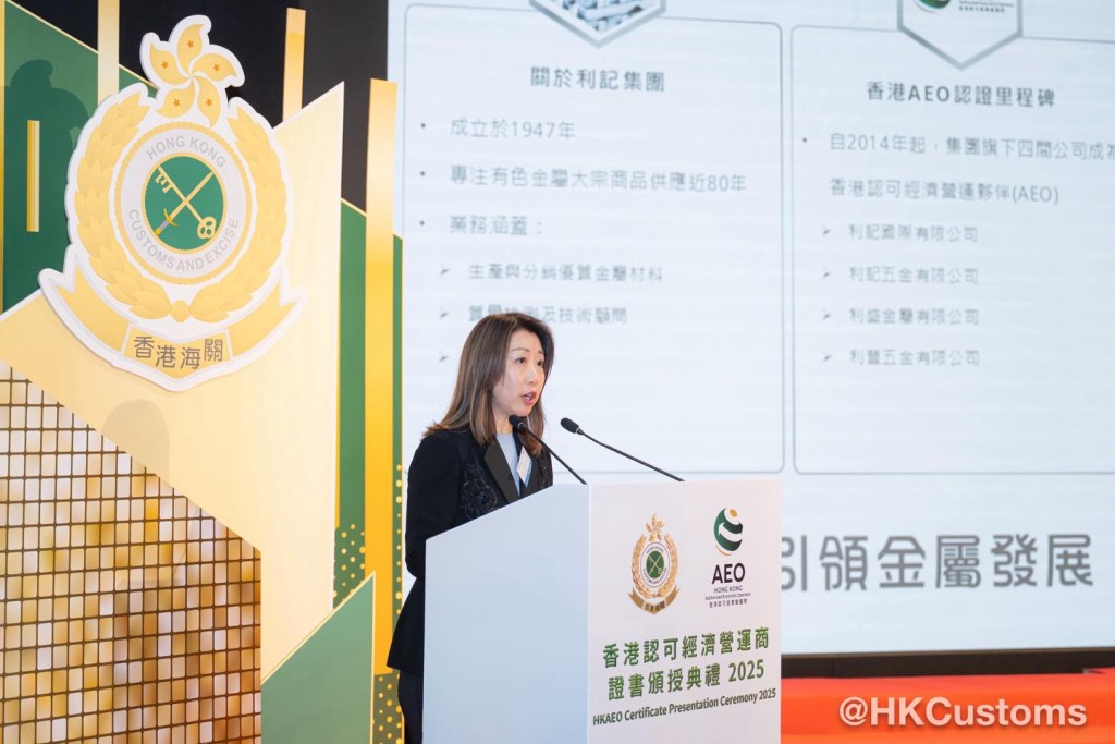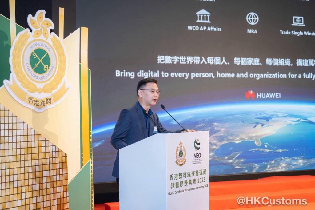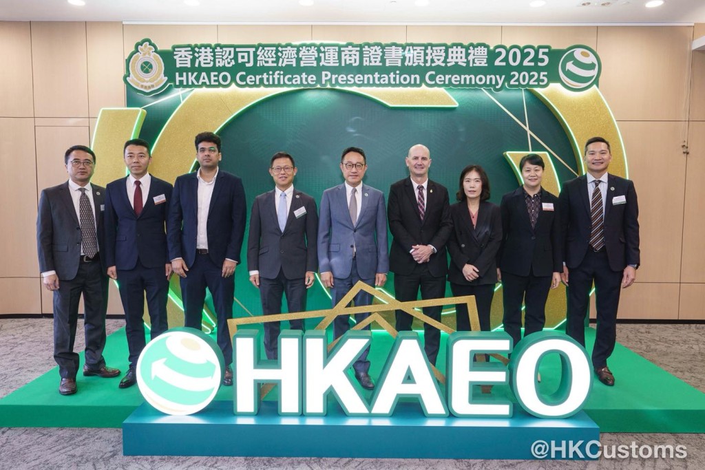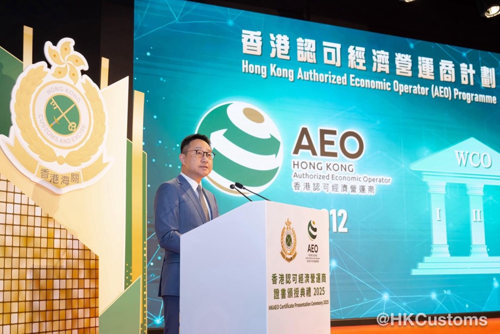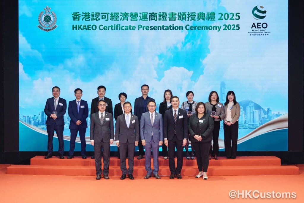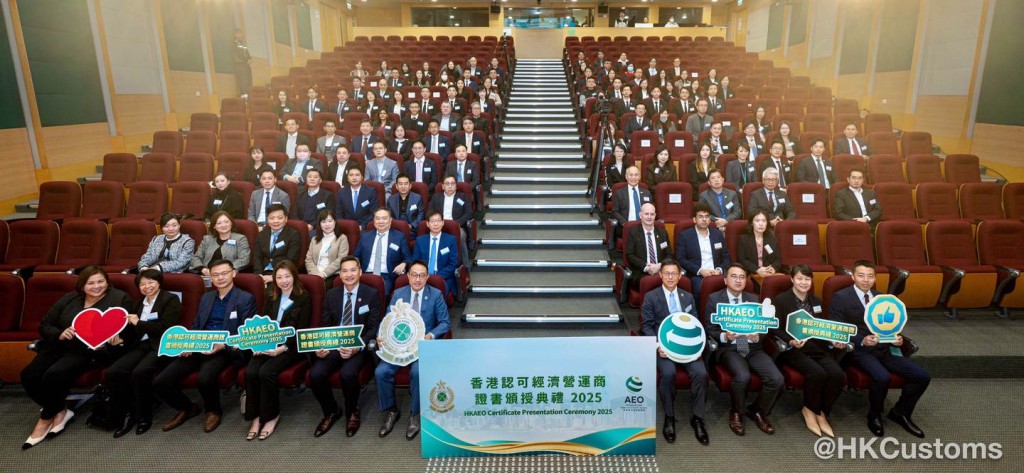 香港海關於2月5日在海關總部大樓舉行「香港認可經濟營運商證書頒授典禮2025」,共約120位嘉賓出席,包括中聯辦代表、外國海關專員、香港AEO成員、商界和業界代表。在典禮上,海關除了向獲新認證和成功續期的AEO頒發證書外,亦向9間AEO企業頒授「香港認可經濟營運商夥伴計劃」年度獎項,以表揚該企業在推廣香港AEO計劃及於其他海關合作事務上的卓越表現。