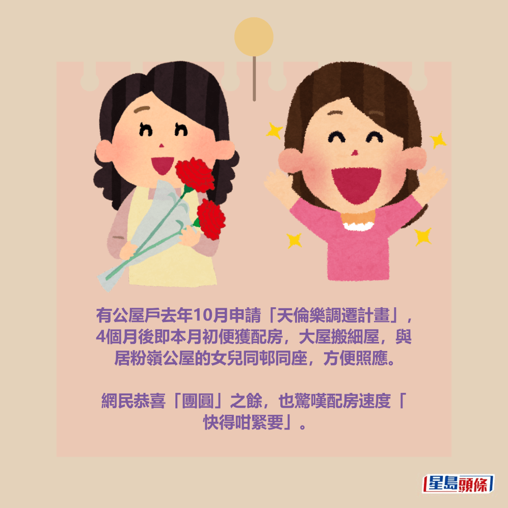 有公屋戶去年10月申請「天倫樂調遷計畫」,4個月後即本月初便獲配房,大屋搬細屋,與居粉嶺公屋的女兒同邨同座,方便照應。網民恭喜「團圓」之餘,也驚嘆配房速度「快得咁緊要」。詳情見下圖及下文: