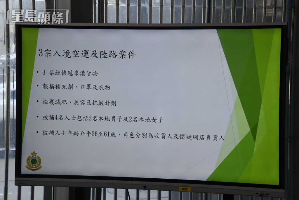 另外3宗入境的空運及陸路案件,海關在3個快遞來港、報稱是「補充品、口罩及衣物」的案件中,發現減肥針劑、美容及抗縐針劑,並根據貨物資料,拘捕相關收件人。被捕4人包括2名中國男子和2名本地女子(26至61歲),各人的角色分別為收貨人及懷疑網店負責人。