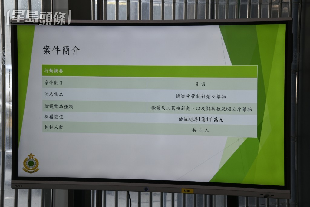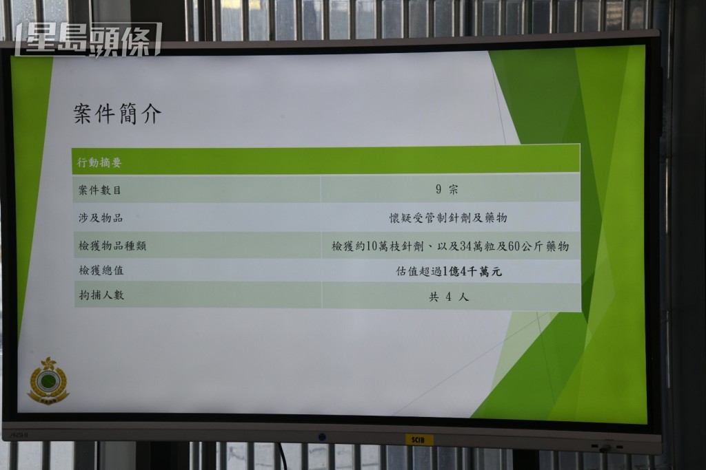 海關偵破9宗走私受管制針劑及藥物案件,檢獲約10萬支針劑、34萬粒及60公斤藥物,市值超過1.4億元,並拘捕4名男女。