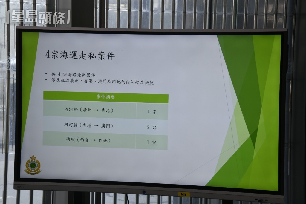 至於其餘4宗海路走私案件,大批走私針劑及藥物分別在一艘由廣州經內河船抵港、2艘由香港準備前往澳門的內河船,以及1艘於西貢準備走私往內地的快艇旁邊的貨車上查獲,海關表示正全力追查涉案的付貨及收貨人,不排除有更多人被捕。