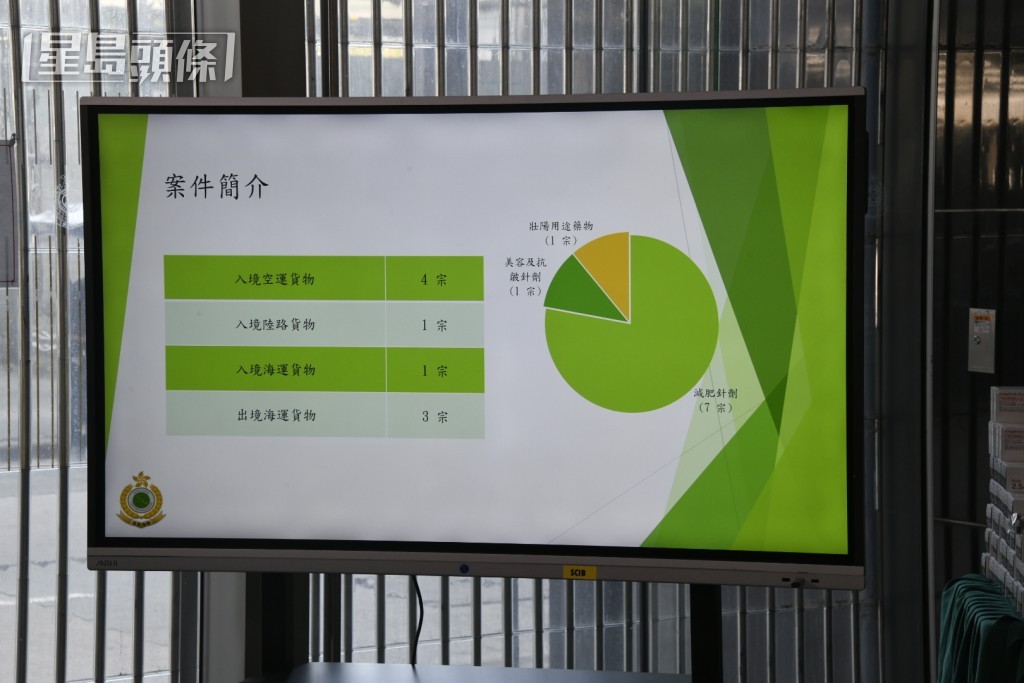 海關有組織罪案調查科特別調查第一組指揮官鄧卓諱表示,今年1月起,香港海關留意到受管制針劑及藥物的走私活動有上升趨勢,加上市場需求殷切,於是展開全方位執法行動,涵蓋進出口、儲存及銷售層面。在整個行動中,海關共偵破9宗,包括4宗入境空運貨物、1宗入境陸路貨物、1宗入境海運貨物和3宗出境海運貨物。就檢獲物品的種類而言,7宗案件涉及減肥針劑,1宗涉及美容及抗縐針劑,以及1宗涉及壯陽用途藥物。