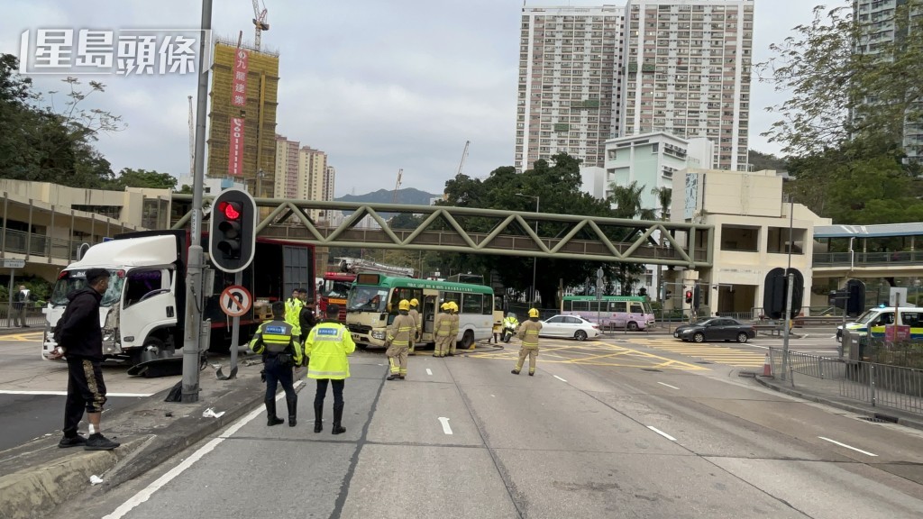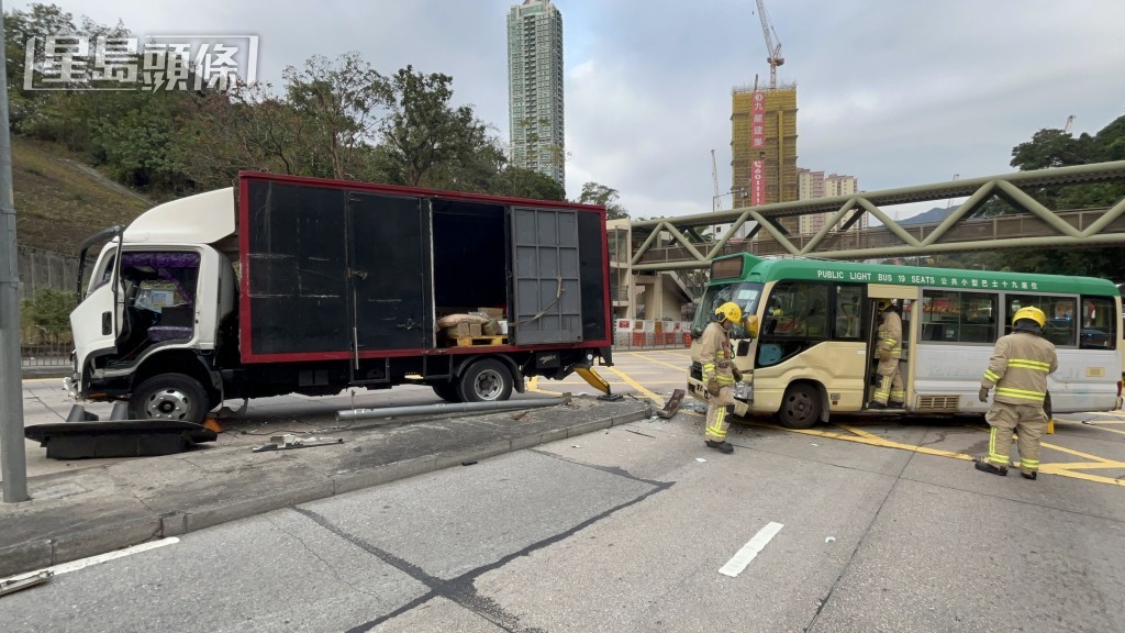 所见货车与绿Van相撞后,继而铲上路中分隔石壆,撞毁一支交通灯柱及灯箱,并越过对面行车线才停下。绿Van右边车头严重损毁,挡风玻璃爆裂,交通灯柱的灯罩亦跌在路上。而货车的一名南亚裔男乘客手脚受伤,经包扎后拒绝送院。事发时有蓝车私家车途经现场,私家车司机目击经过,亦在场协助警员调查。