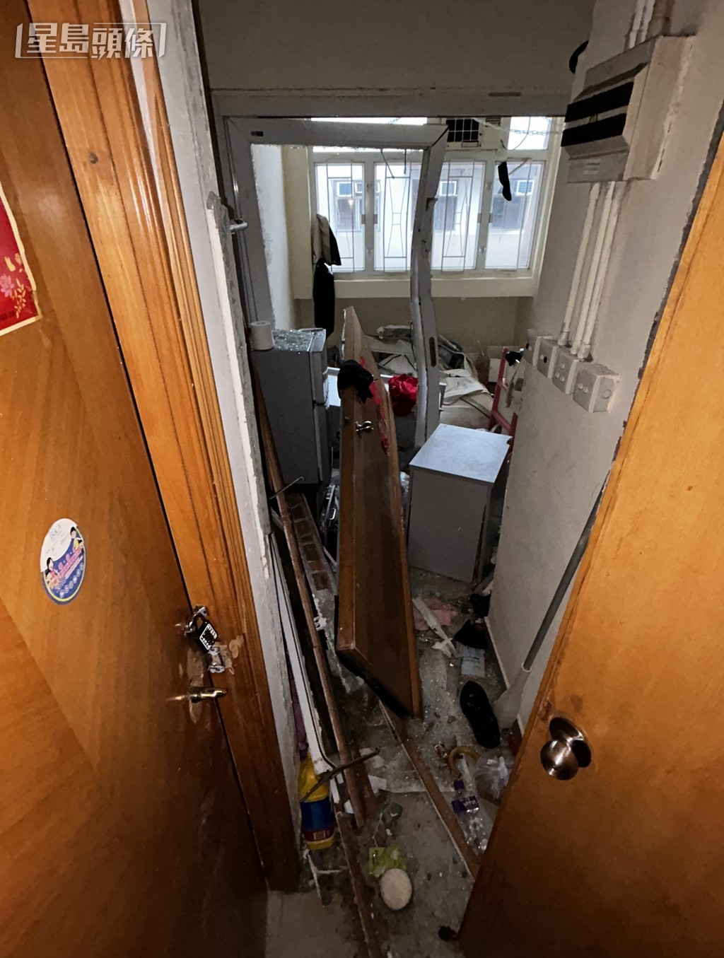 大埔富善街53號富蔭樓一單位昨日(3月2日)發生電熱水爐爆炸家居意外,由內地來港探親的三嫲孫受傷,需急送院治理。涉事單位內貌曝光,所見爆炸過後單位內滿目瘡痍,大門和劏房門均損毀,有木門倒下,門框和窗花變形,一扇窗花被炸飛。全屋遍地玻璃碎片,滿佈雜物凌亂不堪;而牆壁亦出現裂痕,可見爆炸威力之大。