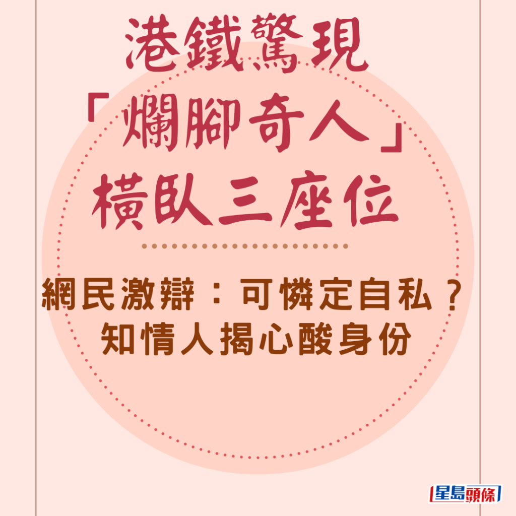 港鐵驚現「爛腳奇人」橫臥三座位 網民激辯:可憐定自私?知情人揭心酸身份↓↓↓↓