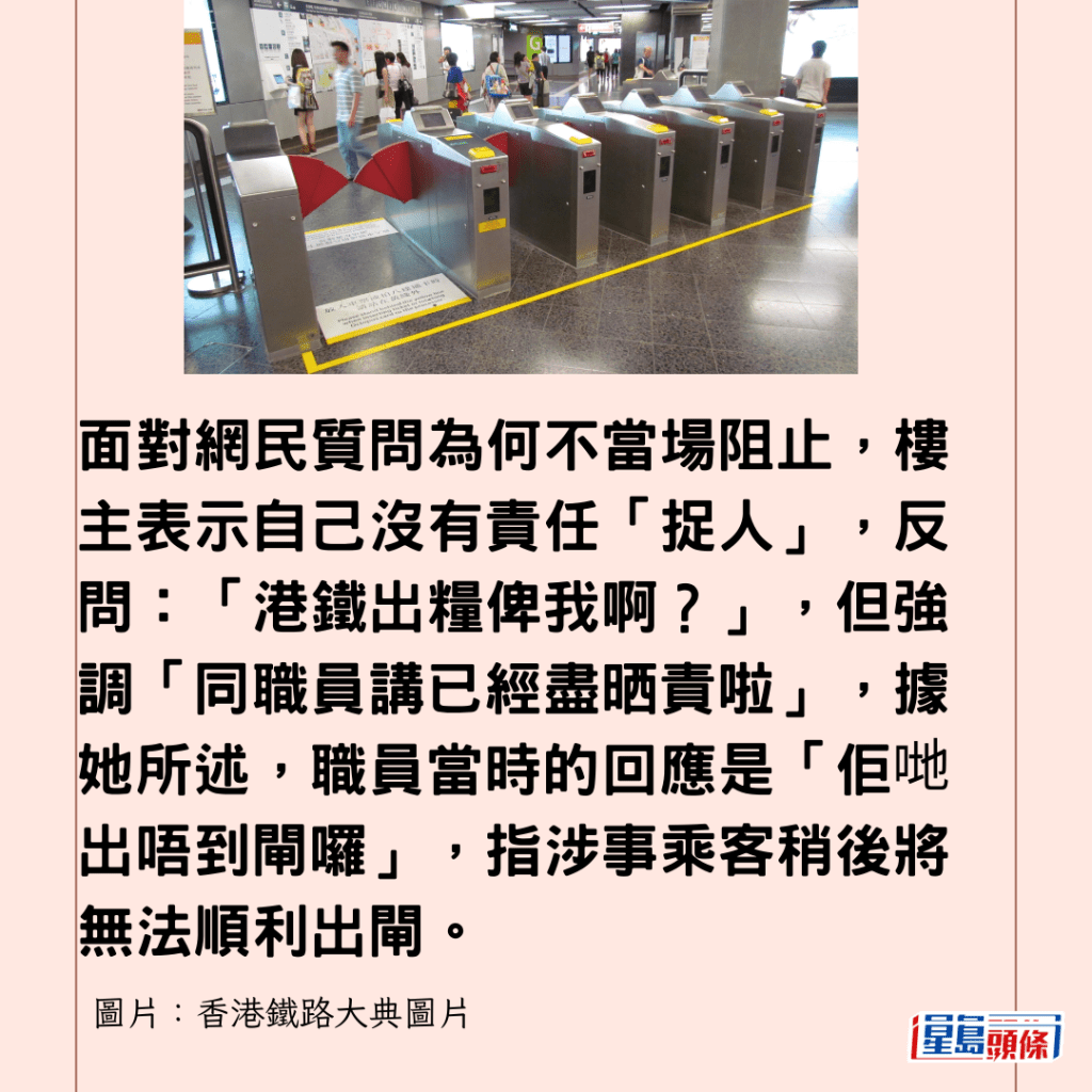 部分網民又質疑港鐵職員為何容許該男子進入車站,有人引用《鐵路附例》28G條「衣着不恰當」的條文,認為港鐵有權拒絕其入閘。