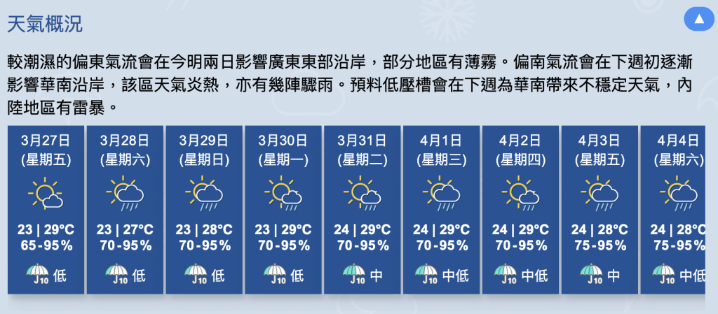 展望明日早上仍然較為潮濕,星期日及星期一有一兩陣驟雨,日間炎熱。