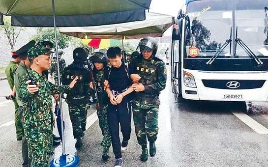 (星岛日报报道)越南史上最大赌博案涉案中国疑犯被遣返!越南警方上周六破获一宗网络赌博案,总交易金额达三十亿元人民币(约港币三十四亿元),逮捕近四百名中国疑犯,越南警方表示,“这是越南历来最大的赌博集团”。越南警方前日在中越边境友谊关口岸向中国警方移交了涉案的三百九十五名中国籍犯罪团伙,由于涉案人数众多,越南警方包车押送疑犯。