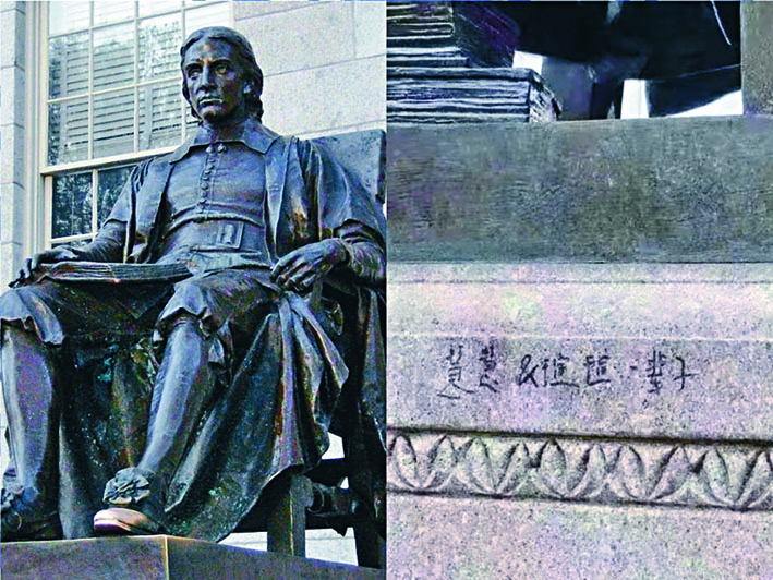 (星島日報報道)美國著名大學哈佛大學內地標「約翰.哈佛雕像(JohnHarvardStatue)」近日被發現有人用中文字塗鴉(見圖),當地民眾拍下照片,在華人社群媒體圈瘋傳。據知,雕像疑似於上月三十日被人在底座側面和背面寫下「慧慧&瑄瑄一輩子」和另一句中文粗口。由於有網友指出字體繁簡並用,引起兩岸網友論戰,但也有人指出,中文字體不能代表就是華人所為。
