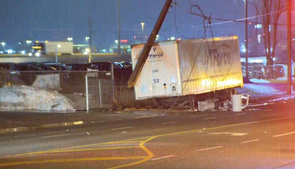 警方正调查1辆货柜车失控撞断路旁1支电灯柱的事件。多伦多警队表示,事件发生于周二(3日)晚上大约11时,位于怡陶碧谷Belfield路东,1辆货柜车驶经上址时,在1个弯位突然失控,货柜车冲出马路,撞断路旁1支电灯柱,由于电灯柱被撞断,3个变压器跌在路上。警方一度将该段道路封闭作调查。(图片:CityNews)T02