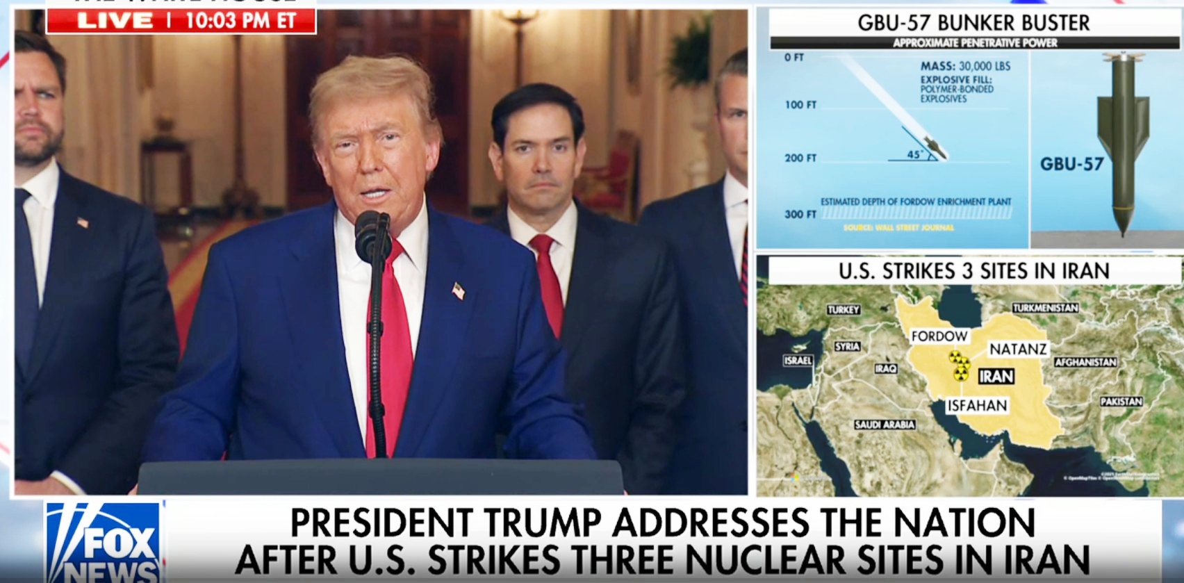 特朗普在今晚舉行的記者會中宣布,美國對伊朗三處核設施(Fordow、Natanz和Esfahan)進行了成功軍事打擊,並強調這次行動「完全成功」,形容為「壯觀的軍事勝利」。