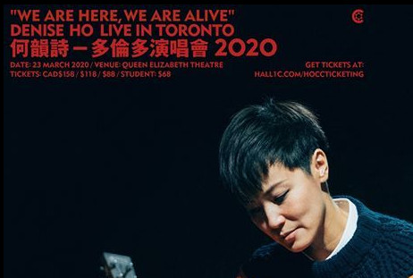 何韵诗周二在其个人Facebook专页宣告,因应加拿大安省的疫情日渐严重,为保障观众、工作人员及演出者之健康及安全,必须作出困难的决定。取消3月23日于QueenElizabethTheatre的《何韵诗DeniseHo“WeAreHere,WeAreAlive”多伦多演唱会》。