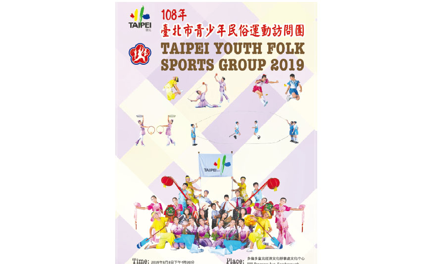 臺北市青少年民俗運動訪問團訂於8月8日,在駐多倫多臺北經濟文化辦事處文化中心進行訪演,節目包括扯鈴、踢毽、跳繩及民俗舞蹈等,歡迎家長攜帶子弟踴躍出席觀賞。臺...