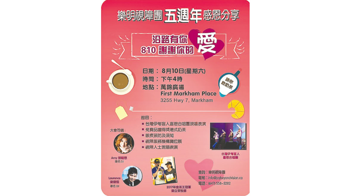 致力服務多倫多失明及弱視人士的樂明視障團,今年慶祝成立五周年,特別於本周六(8月10日)下午4時,於萬錦廣場舉行「沿路有你810謝謝你的愛」5周年感恩分享會,與大眾分享過去5年工作成果,並展望未來工作,希望能幫助及服務更多華裔視障人士。