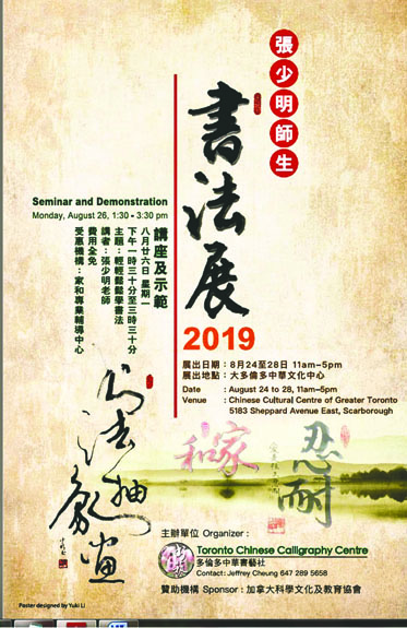 多倫多中華書藝社張少明老師,將於8月26日假大多倫多中華文化中心,舉行免費書法講座及師生書法展。此次活動必要開支以外的收益,將全額贈予家和專業輔導中心,協助搬遷新址並持續為華語社區提供多項家庭、心理、特殊需要及移民安居服務。