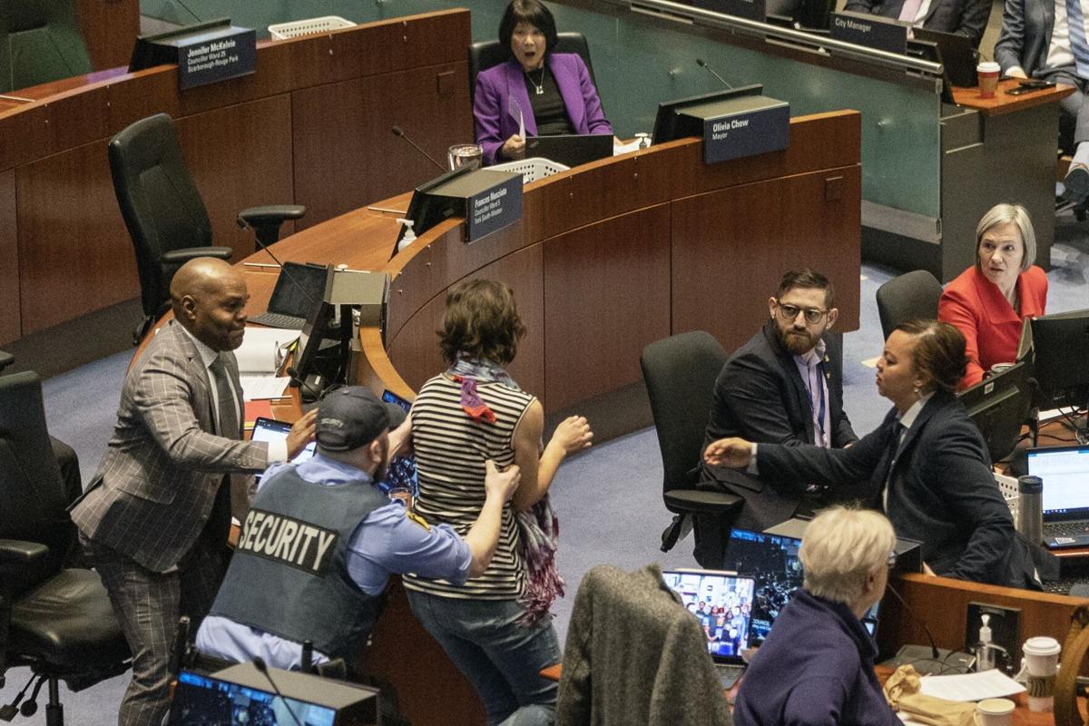 【星島綜合報道】多倫多市正審議市長鄒至蕙提出的最新預算案,當中包括加地稅6.9%的提案。今午(11日)有蒙面示威者闖入市議會大廳,會議一度中斷。蒙面示威者闖入市議會大樓,高叫口號抗議,指責市政府對露宿者和窮人面對的治安問題視而不見。其中一名示威者疑似試圖展開巴勒斯坦國旗。其後示威者被保安驅逐離開現場,會議一度暫停。 (圖:CP24)T12