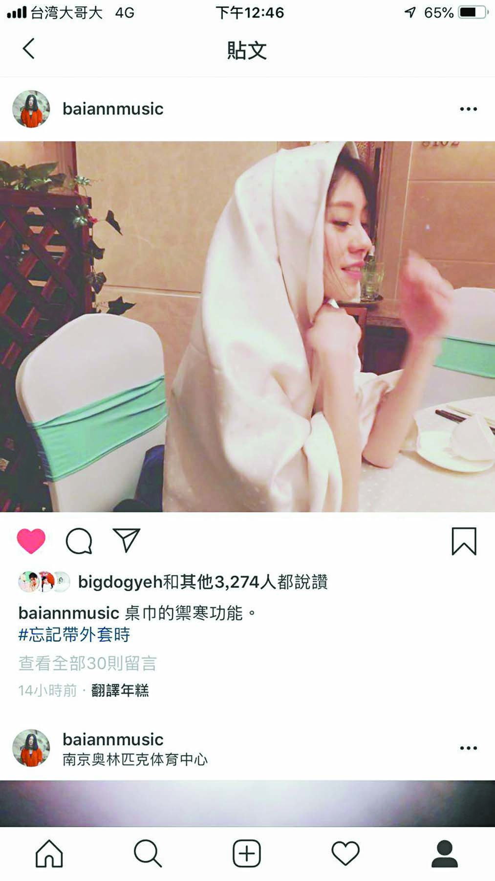 据中国时报报道,说到白安向来怕冷,也常发生趣事。她日前到新加坡参访室内花园,大家都穿短袖上衣,只有她穿长袖上衣,还围着大围巾。而她日前到南京一家餐厅用餐时,还因为忘了带外套,觉得室内冷气太强,而把餐桌巾披在身上御寒,丝毫不在意其他顾客的眼光。