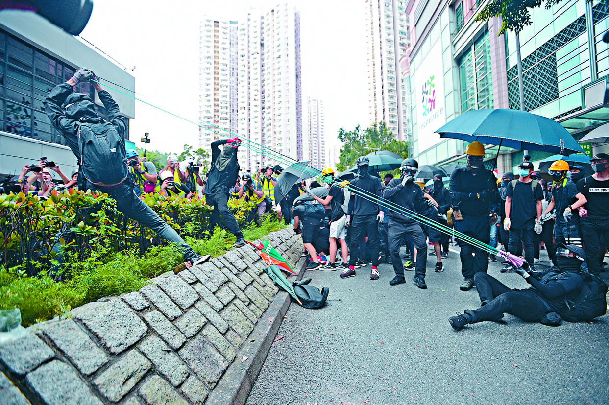 示威者巨型「人肉丫叉」射磚轟警署