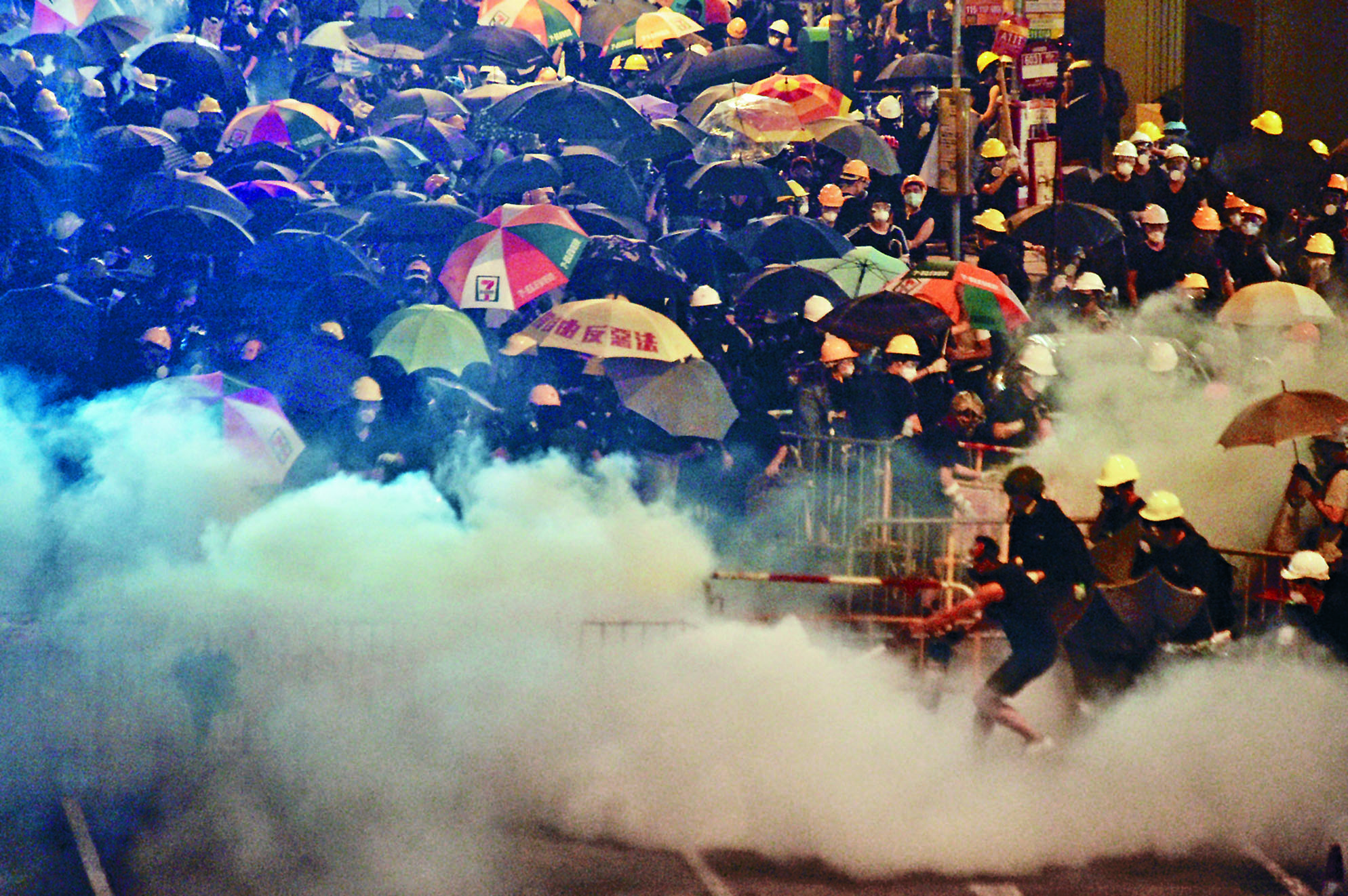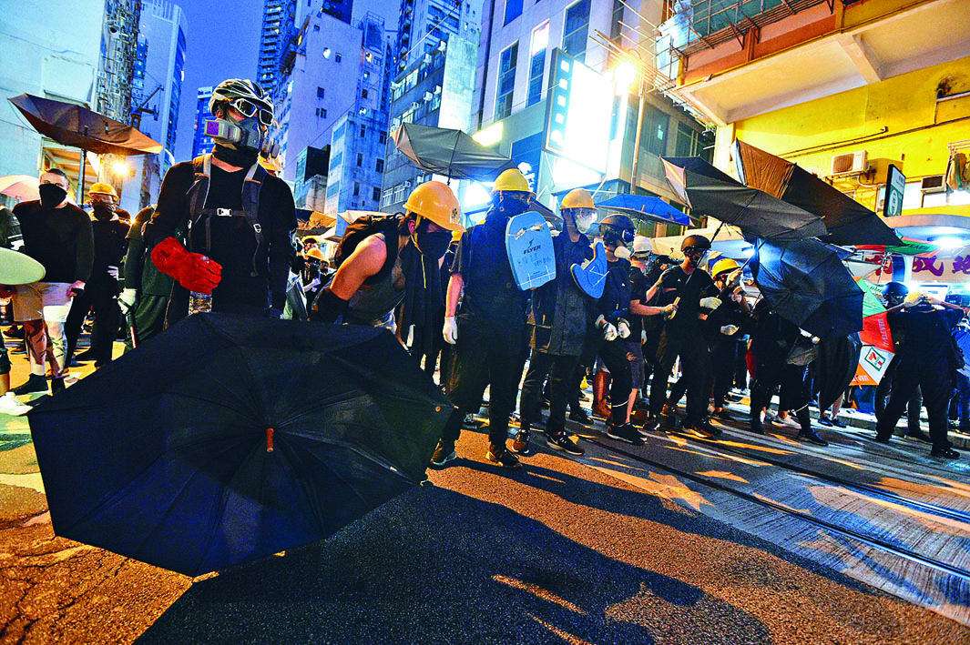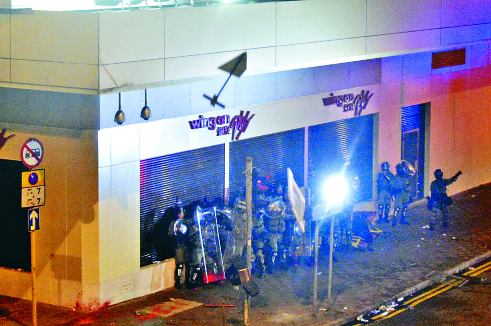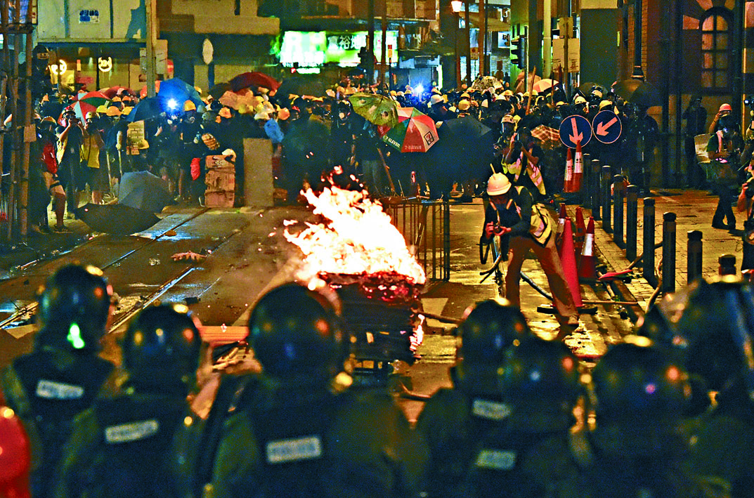 (星岛日报报道)示威者与防暴警在上环攻防战,令港岛海陆交通大瘫痪,商户纷纷落闸停业,其间更因电力故障,港岛巿中心发生逾百宗困升降机事故,情况恍如战场,一片混乱。