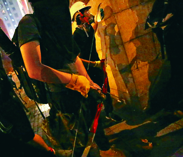 (星岛日报报道)经历一个多月的警民冲突事件,示威者“作战”经验与日俱增,众人昨面对警方“开枪”,不但未有四散,更企图以不同具杀伤力武器反击,当中有人从天桥上扔下路牌等重物,也有人将杂物放于手推车上点火,企图推向警方防线,网上疯传照片中,更有示威者手持疑似汽油弹和弓箭(见图),武力明显“大升级”。