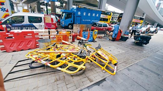(星岛日报报道)中西区前晚爆发激烈警民冲突过后,昨日部分街道一片狼藉,路面遗下大量示威者的物资、警方使用的催泪弹壳,以及被拆毁的路牌和铁栏等物件,不少墙壁和地面被人以油漆喷上“光复香港”等字句,清洁工人忙于清理。