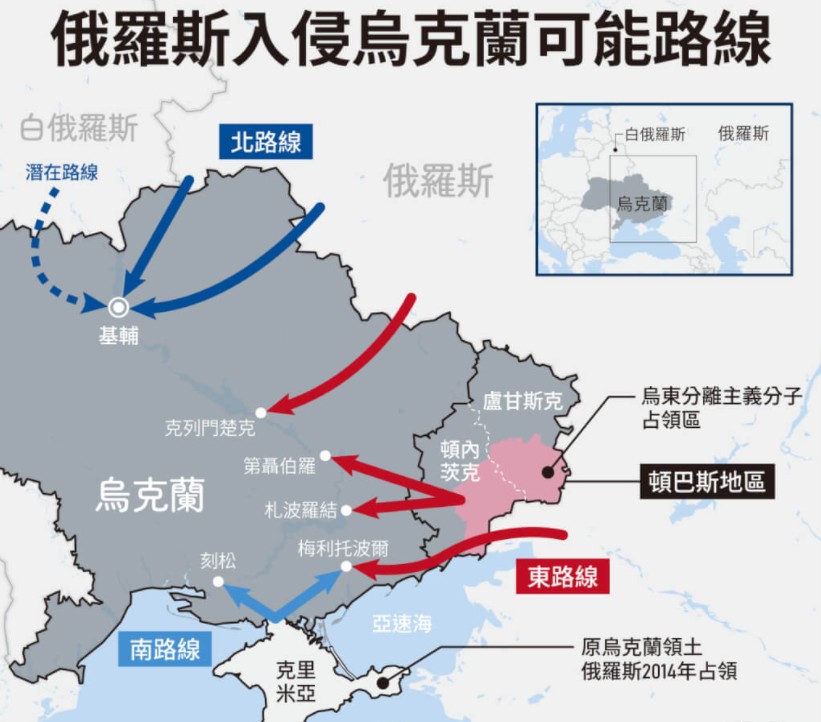 俄罗斯21日宣布俄罗斯承认乌克兰东部两个分离主义分子控制地区为独立国家,范围涵盖目前由乌克兰政府军掌控的领土,他更下令俄军在该两个共和国执行维和任务,俄罗斯连夜派出俄军装甲部队入境“维和”。令西方更加忧心莫斯科即将对乌克兰展开全面入侵行动。