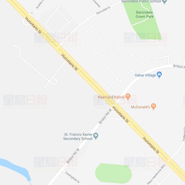事发地点Map截图据皮尔区警,今晚8:40,在密西沙加市Hurontario和Barondale附近,4两车发生撞击。为了协助警方调查,该路口已被封锁。目前警方仍未确定伤亡情况。(智苏编辑)