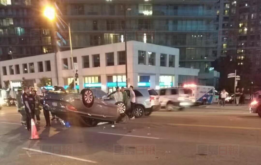 图片来源:网友据CP24报道,昨晚约9:30,在Yonge夹Finch附近发生严重车祸,其中一辆车底朝天翻转过来。医护人员说,一名20多岁的男子已被送往附近的创伤中心,情况稳定。从路人抓拍的照片看来,警方和救护人员已赶到现场,正在与几名疑似亚裔的人员交涉。(智苏编辑)