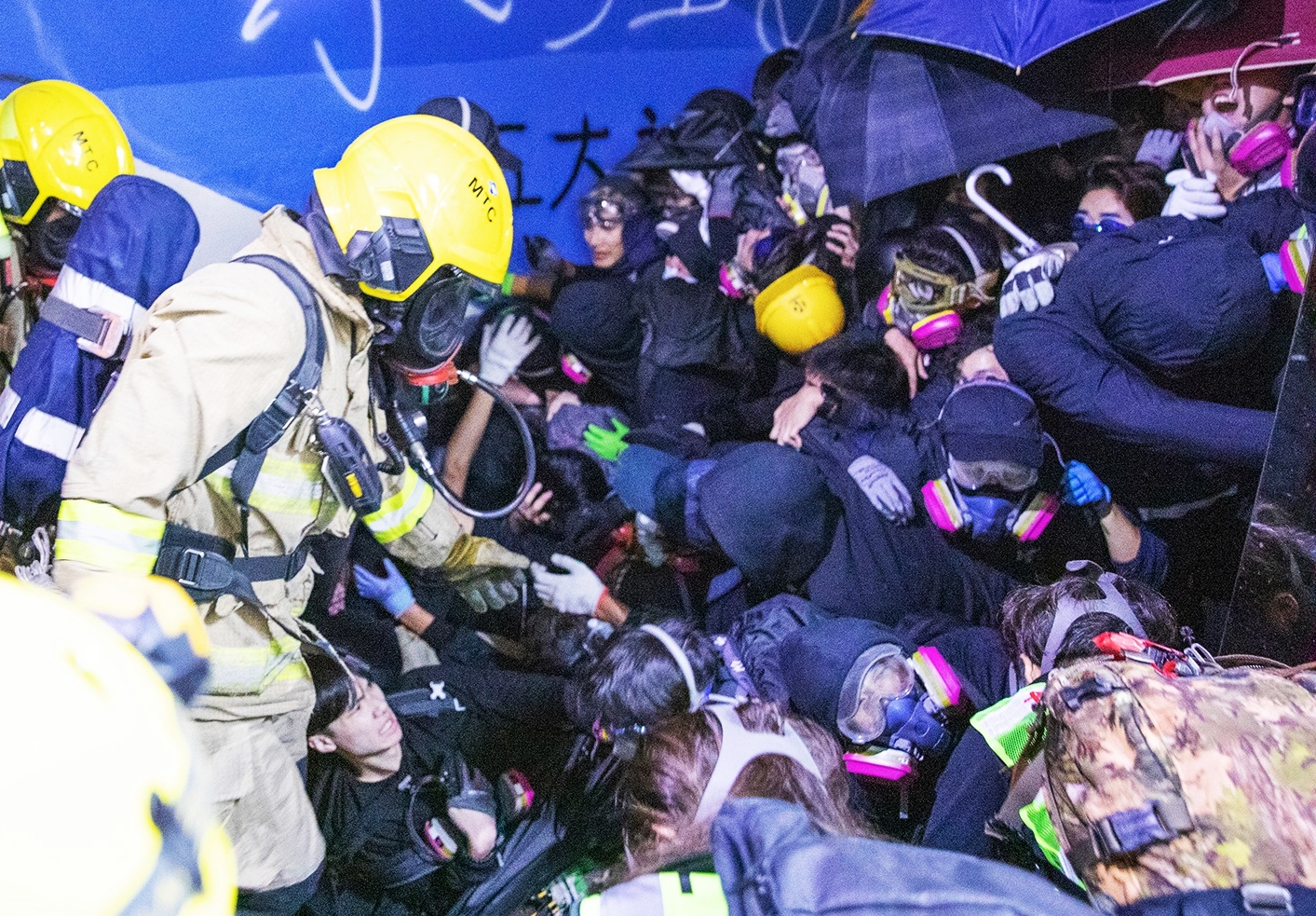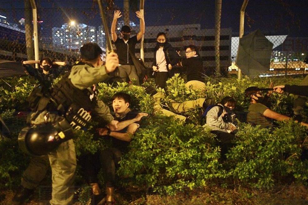 盤踞香港理工大學的「勇武派」中堅分子連日堵路,更向清理路障的市民擲石,防暴警趕至施放催淚彈,示威者隨即狂擲汽油彈,向警員射箭,警方一輛裝甲車亦中箭中彈起火。大學校園宛如戰場,雙方激戰至18日尚未平息,隨著示威者第3度走出理工大學,周一下午2時左右,理大對出的衝突升溫,防暴警制伏十多名走出的示威者,並繼續施放多輪催淚彈,期間有防暴警被推倒。警方正呼籲示威者投降。