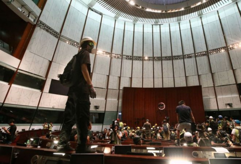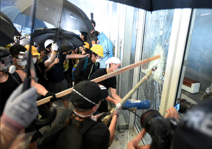 在香港,要求撤回《逃犯条例》的暴力示威者,7月1日由早到晚展开连番冲击行动,其中经八小时历史性“攻占”立法会大楼,约三百人在大楼内大肆破坏,包括以黑色喷漆涂污议事厅主席台上的特区区徽,破坏历届立法会主席画像及毁掉大批电脑和文件。立法会“沦陷”三小时后,逾千防暴警待七.一回归日过后的2日凌晨出动清场,施放多枚催泪弹驱散示威者。香港特首强烈谴责暴力行为。