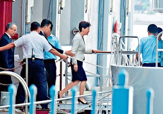 示威者一日凌晨冲击警方防线,企图硬闯金紫荆广场破坏升旗礼,警方为确保中联办主任王志民、特首林郑月娥等高官顺利出席庆典,一日晨安排众人到西湾河水警基地,登上海事处接待贵宾的船只,经由三艘水警快艇护航下赴会,本报独家摄得众人登船情况。