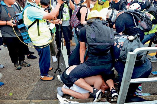 金钟龙汇道示威现场一日晨“节外生枝”,三名操普通话男子,被指近距离拍摄示威者容貌,遭大批人士包围追究,其中二人突围逃脱,另一人却无法脱身,并发生激烈拉扯,被围男子遭暴力对待,被按地上及遭示威者骑着,上衣亦被扯烂,他情绪激动把手机狂击地上损毁,其后获送院治理。