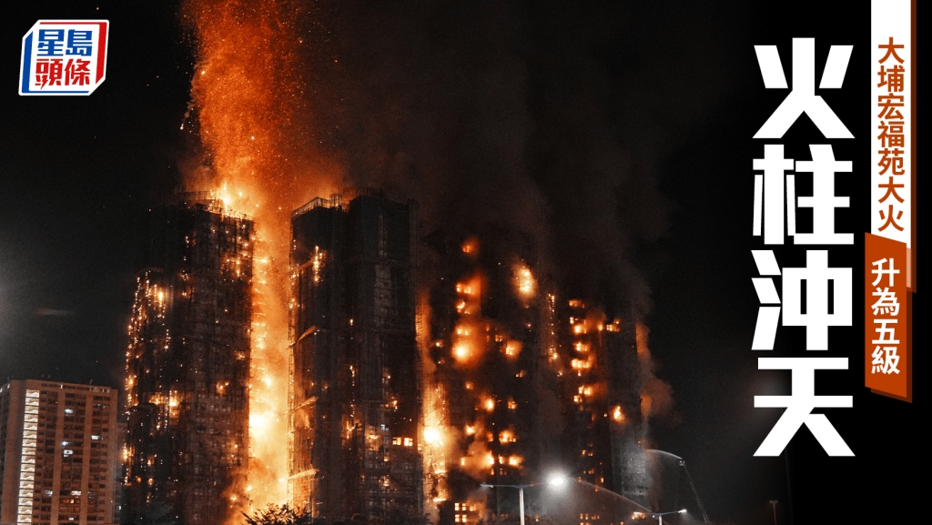 大埔发生五级火。今日(26日)下午2时52分,大埔宏福苑宏昌阁发生火警,现场火势猛烈,冒出大量浓烟席卷半空,多名居民报案。消防员到场发现大厦外墙棚架起火,动用两条喉及两队烟帽队灌救。消防处表示下午3时02分将火警升为三级,并于下午3时34分升为四级,并于下午6时22分升为五级。火警酿成至少13死及多人受伤,消防人员正进行灭火行动。有居住在宏昌阁的住户,身在现场目睹自己家园被烧,伤心痛哭。
