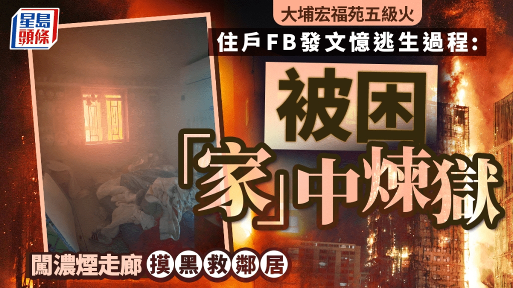 大埔宏福苑周三(28日)发生五级大火,造成多人伤亡。一名获救者在社交平台发文忆述亲身经历火灾的惊险过程。事发当日,事主在家中休息时接到太太电话,通知大厦发生火灾,正准备开门逃生之际,浓烟瞬间涌入,形容“眼前一黑,浓烟将我吞噬”,即使打开手机电筒仍伸手不见五指,呼吸困难,被迫退回单位。