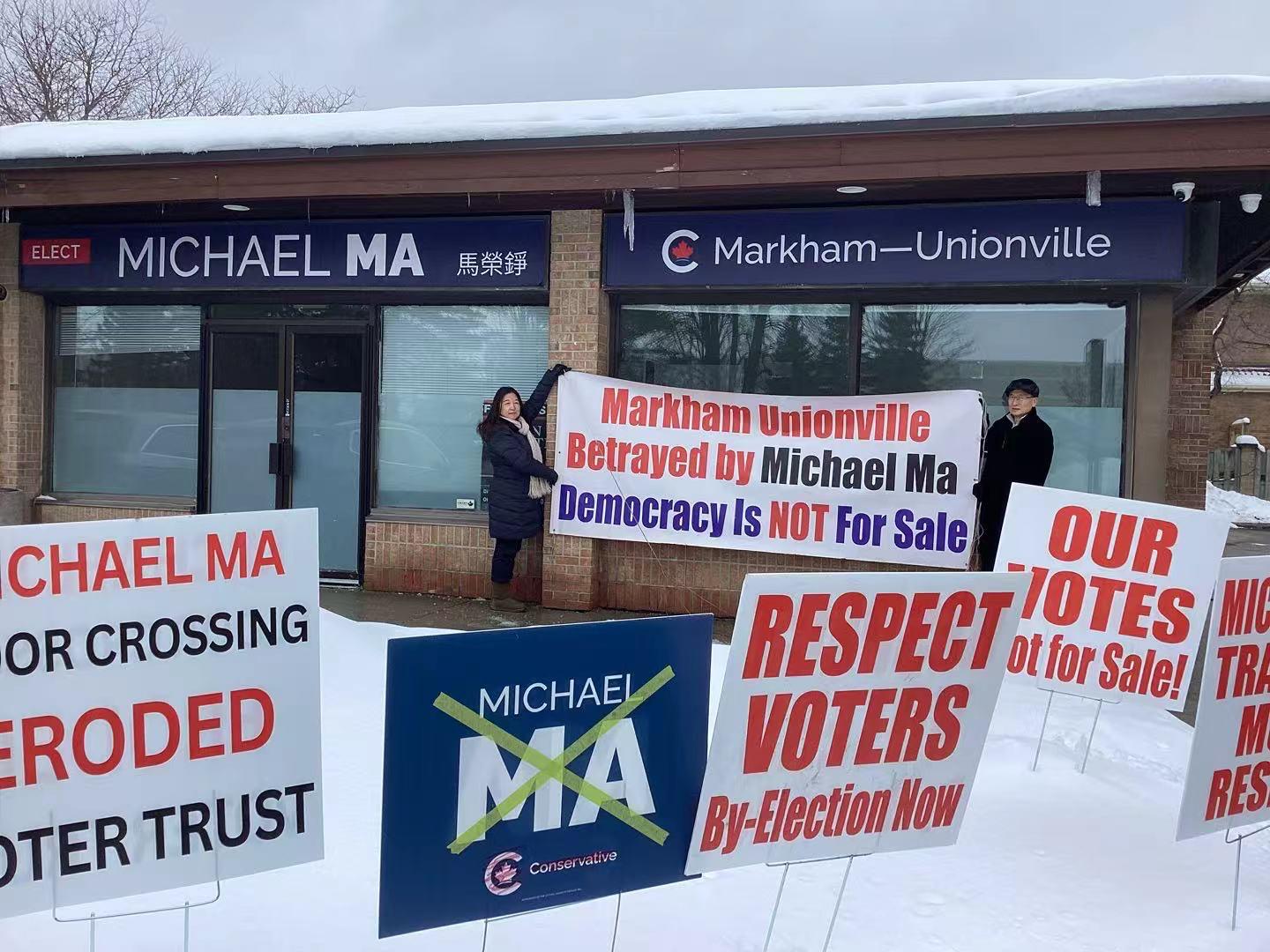 【星島記者王婷報道】幾個萬錦選民周六(10日)晚間先後到萬錦MarkvilleMall「金瑞麟」及士嘉堡「豪門宴」酒樓門外拉橫幅示威,抗議安省萬錦—於人村國會議員馬榮錚在上月轉投自由黨後,仍未正面回應保守黨支持者的聲音。選民批評馬榮錚「背叛選民」,示威約兩小時後和平散去。