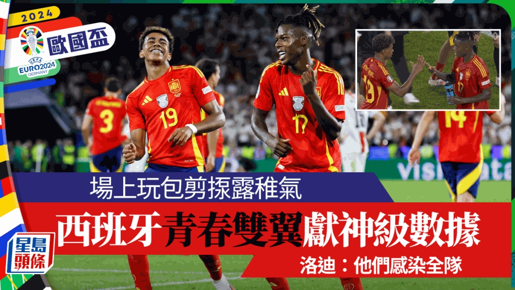 西班牙于周日欧国杯16强4:1大炒格鲁吉亚,年轻双翼拉明耶马和尼高拉斯威廉斯继续神勇,共炮制3个入球,而且各交出神级数据。而威廉斯士哥后,2人一齐跳舞庆祝,赛后更在场上玩包剪揼,露出稚气一面。中场洛迪卡斯简迪喜闻乐见,指2位年轻人感染全队。