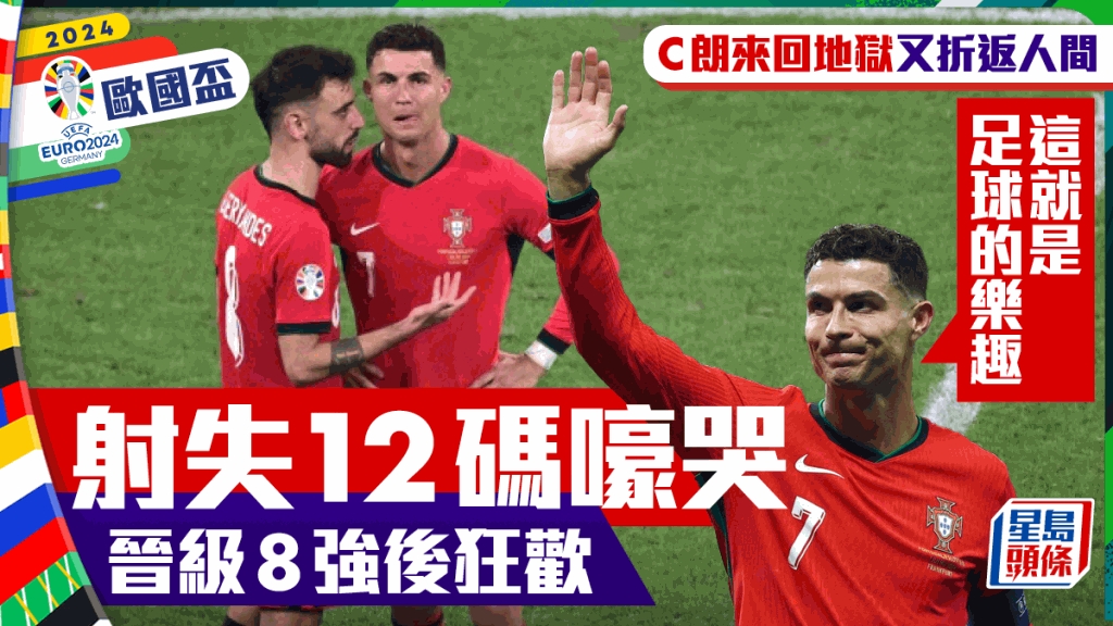 葡萄牙队长C朗拿度于欧洲国家杯16强对斯洛文尼亚,先落地狱再上天堂,短时间内由射失12码的豪哭变为赢波晋级8强的狂欢。C朗赛后表示这就是足球给与他的快乐,难以用言语去形容。