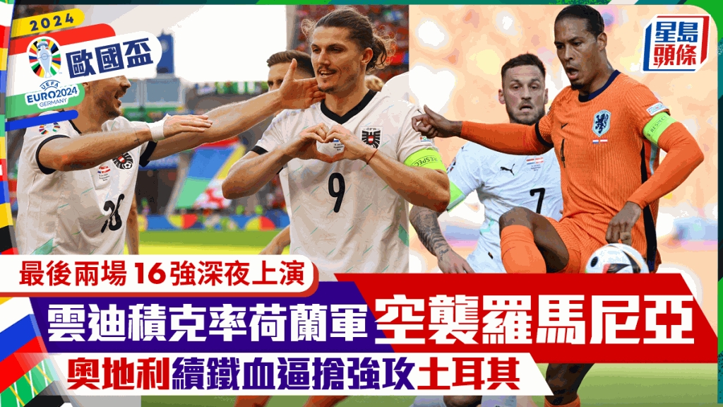 欧洲国家杯今晚上演最后2场16强赛事,荷兰虽然在D组排第3,沦落以4支小组第3名之一出线,但实力仍在罗马尼亚之上,尤其中坚华基尔云迪积克等多人顶上功夫一流,今仗实行以死球战术顶破罗马尼亚防线。另一场奥地利对土耳其,奥地利于分组赛以高强度的压逼,将荷兰和波兰击败,今仗势重施故技,于队长沙比萨领军之下以高压逼抢将土耳其击败。