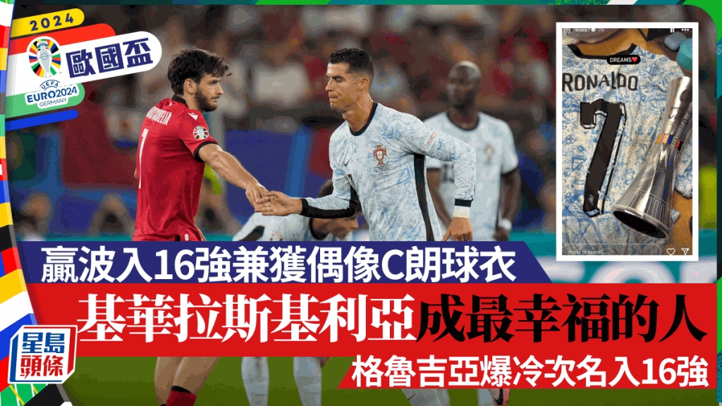 格鲁吉亚于欧国杯F组尾轮爆冷以2:0击败葡萄牙,以小组次名出线16强,首次参加欧洲国家杯就晋级淘汰赛,举国欢腾。而最开心的肯定是前锋基华拉斯基利亚,他一直都很崇拜葡萄牙队长C朗拿度,今次有机会与偶像同场较量,又为球队先开纪录击败C朗,赛后又追星成功获得这名39岁老将的球衣,成为最幸福的人。