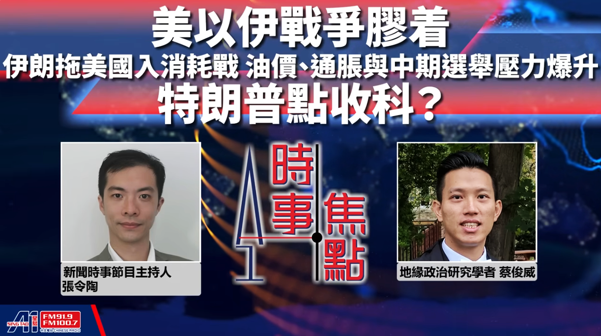 今集《时事焦点》邀请地缘政治研究学者蔡俊威(SamChoi)深入分析:美国现时是否仍然“在赢”?伊朗究竟是否只求打不赢但拖到美国“赢得太贵”?特朗普政府下一步应该升级军事行动、寻找下台阶,还是重返谈判桌?节目亦会拆解这场战争如何冲击美国中期选举、MAGA基本盘,以及美国在中东、印太与全球战略部署之间出现的矛盾与压力。